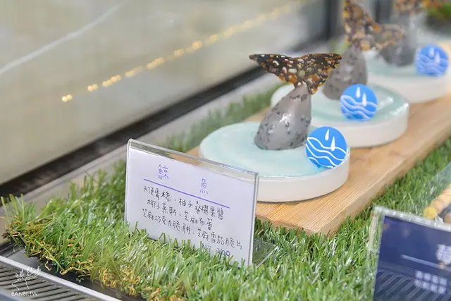 舉例來說,使用公平交易的巧克力,以酸雨為概念的甜點,或是外帶堅持消費者帶環保器皿裝放(一次性的器皿),所以我猜想鯨魚也是為了呼籲大家對於保育類動物與環境的重視吧!