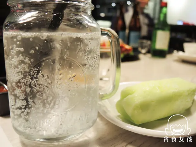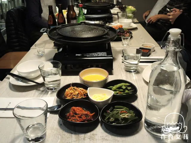 韓式烤肉必備:夾子、剪刀、清油漬的蘿蔔,Major K也都有。約2-3人共用一個韓式烤盤,當然還有附贈水。