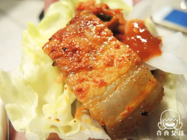 店員小心翼翼的將豬五花肉片攤平,享受著不同顏色肉片帶來的視覺饗宴。店員烤得恰恰好,不會像有些韓式餐廳會烤得太過焦,還會幫你剪成小片好入口。