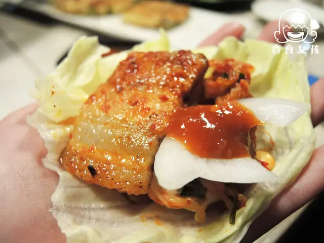 如果想要更不一樣吃法,用生菜包覆著豬五花,加點洋蔥和涼拌豆芽菜,最後在淋上醬料。