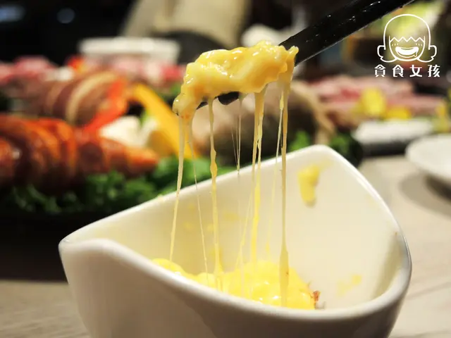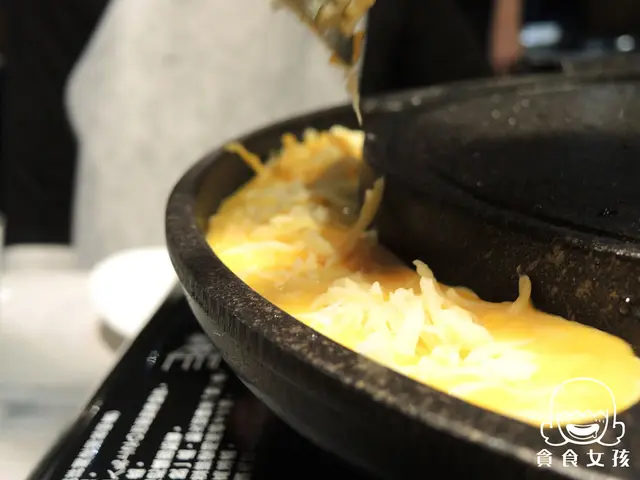 把蛋汁先倒入烤鍋旁中的格子中,再加入起司條,約半熟狀即可挖起。
