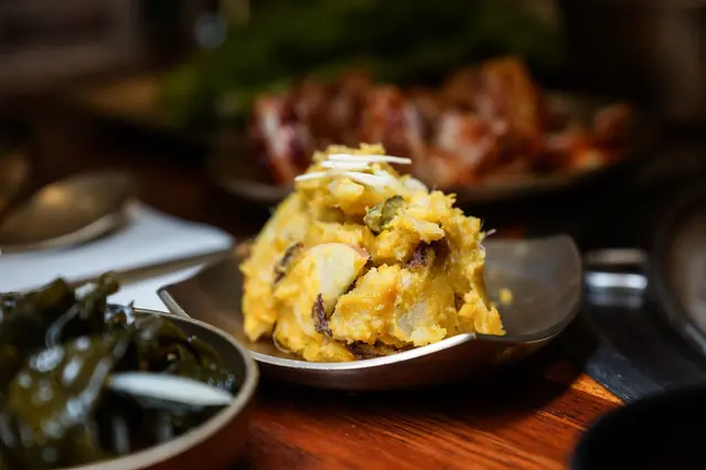 每日現做手捲泡菜,跟台灣常吃到的韓國醃製泡菜,酸味較重不太一樣,反而是辣醬香氣強烈,有股細細的梅子酸甜味蕾,能感受到泡菜本身的原味,整體口感鮮脆且尾韻頗辣!第一次送上桌的泡菜捲店家會現剪給客人享用,而之後續點的部分就會是平常看到那種剪好的泡菜,口味也瞬間變回跟坊間的口味偏酸較像似,有點可惜。