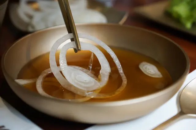 店家在黃銅盤內倒入醬漬洋蔥醬,再夾生洋蔥泡著吃,不過歐奇有點吃不懂意義在那XD 醬汁本身酸酸甜甜,生洋蔥清嗆滋味從中竄出。