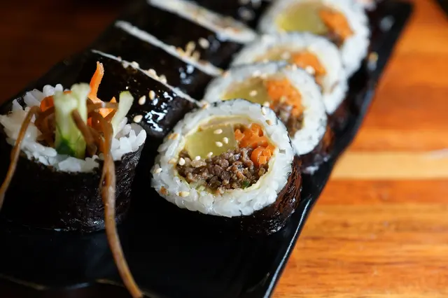 肉類的單價較高一些,因此歐奇很建議可以點份道地紫菜卷墊墊胃,單價是當天餐點裡最低價的XD 口感上以醃製脆黃瓜最為強烈,海苔上用香油均勻的抹上散發淡淡香味,牛肉在飯捲裡的口感不太明顯,主要是火烤過的香氣。