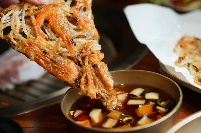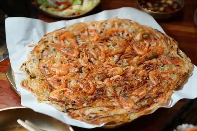 與以往在韓式料理店吃到的煎餅都不一樣!!以地瓜粉、認真大尾的真蝦子、蝦仁加上櫛瓜片油煎炸,口感超級脆口!!!有點像是炸地瓜餅,一口咬下會發出卡滋卡滋聲響,與一般煎餅是加入麵粉的口感完全不同,並且有著很香的油炸香氣及蝦子的香氣,列為當天大家的最愛餐點~
