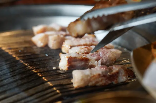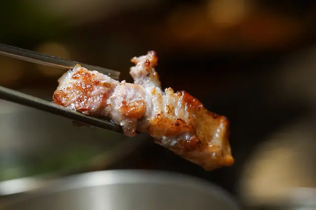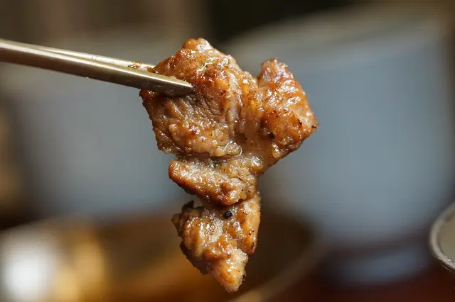 各式肉類中,必點的絕對是厚厚豬五花!!在Meat Love店家都會隨桌服務幫忙烤肉,五花肉油花較多,店家會詢問喜歡吃焦一點的還是一般口感,豬五花當然要吃焦一點的口感~烤至表面金黃上色後再將豬五花剪開,繼續烤至各面都是恰恰的口感。