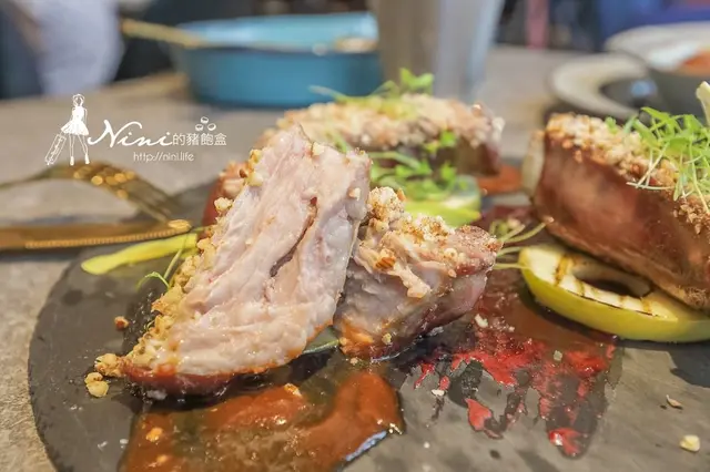 油封盤克夏聖路易排、豬肉濃縮醬、杏仁、青蘋果