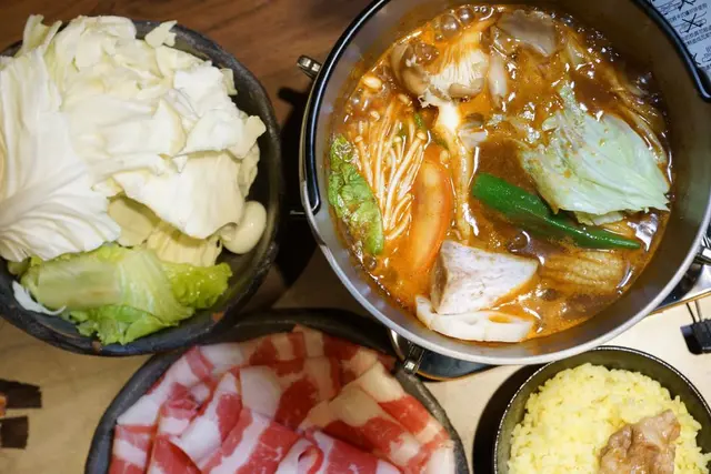 涮涮鍋套餐,包含肉盤、蔬菜盤、GARAKU招牌薑黃飯以及香濃的咖哩湯底。