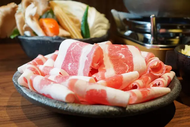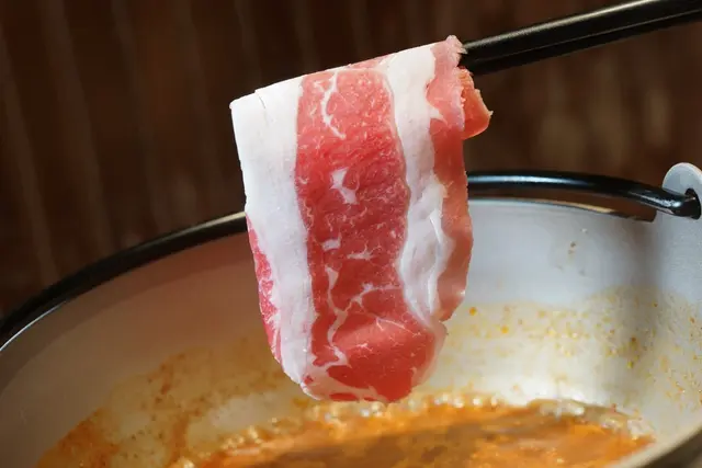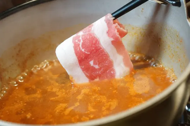 把蔬菜都先加入咖哩鍋裡燉煮後,就可以來涮肉片了~牛中腹油花相當豐富,可以想像油脂涮煮後滋味有多美妙。