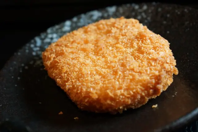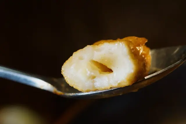 單吃有些乾,泡在湯咖哩內吸上湯汁,雖然口感因此較不脆口,但多添了咖哩香氣味蕾上較為豐富。