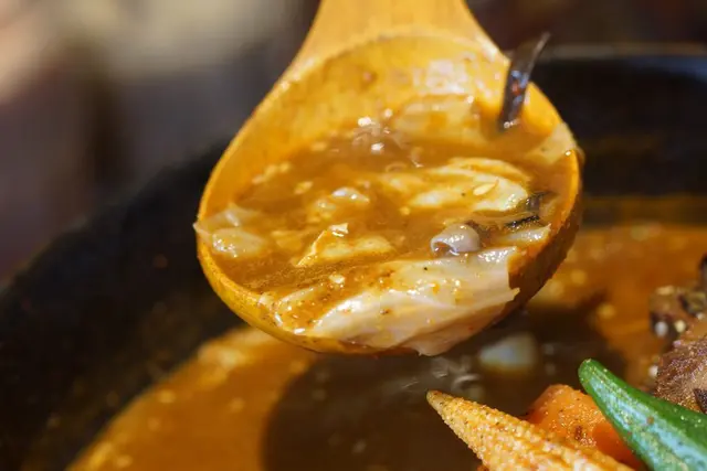 湯頭部分入口如麻辣鍋般辛香料的香氣及豐潤韻味,還有著明顯的柴魚香氣,接著咖哩的香氣慢慢飄出,最後喉間持續殘留著辛辣感。GARAKU家的湯咖哩口味其實較偏向南洋風情,辛香料的香氣很濃郁,但又因為沒有加麵粉,所以湯頭很清很順口。