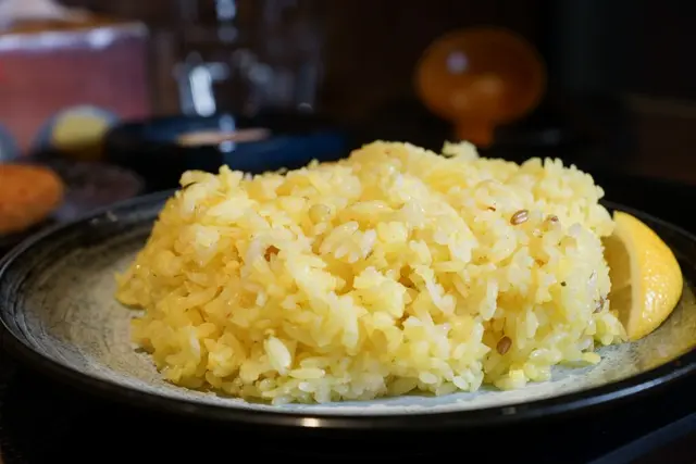 薑黃飯加點十穀米,一旁還附有檸檬可以擠在飯上一起享用 。米飯是有口感的那種,粒粒分明。