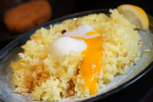 這次我們還單點一顆溫泉蛋,搓破蛋黃,濃稠的汁液緩緩流下與白飯拌勻享用,再泡入一點咖哩醬汁。特別過分!