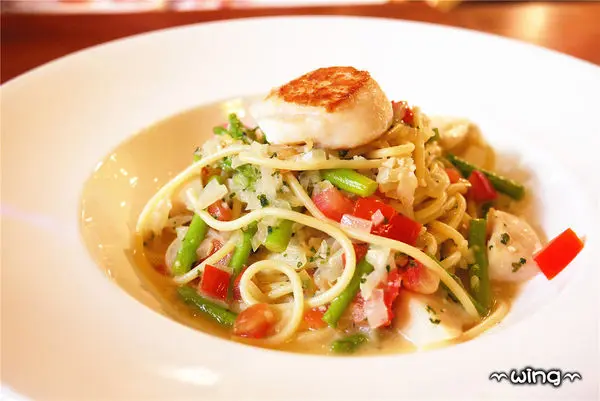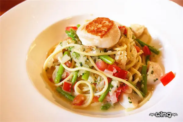 嚴選北海道大干貝,加入塊狀鮑魚、蒜、洋蔥、蘆筍、紅椒等配料一同拌炒,