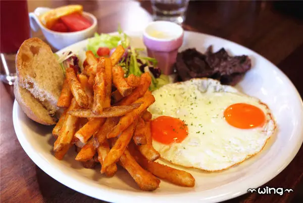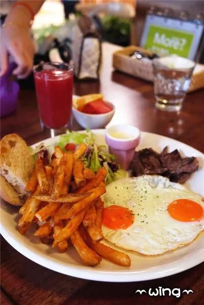 孟欣點了豐盛的早午餐,有新鮮沙拉、太陽蛋、美國牛小排、薯瓣或薯泥二選一,