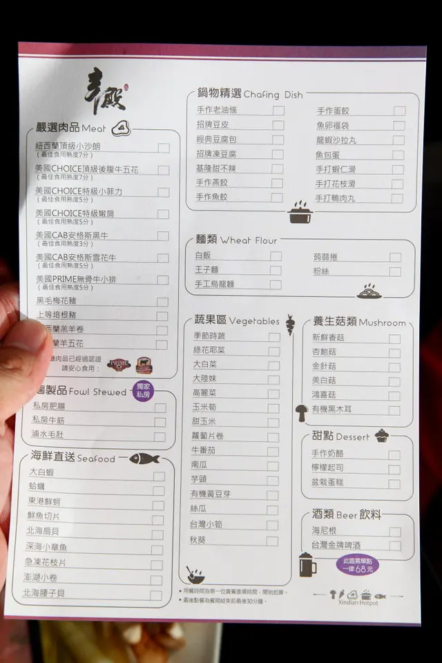辛殿麻辣火鍋-信義店是採吃到飽的模式,畫點菜單後再交給服務生,辛殿麻辣火鍋對於食材品質相當要求,從肉類、海鮮、火鍋料等,幾乎都是經過嚴格挑選才放上菜單,酒類則需另外單點
