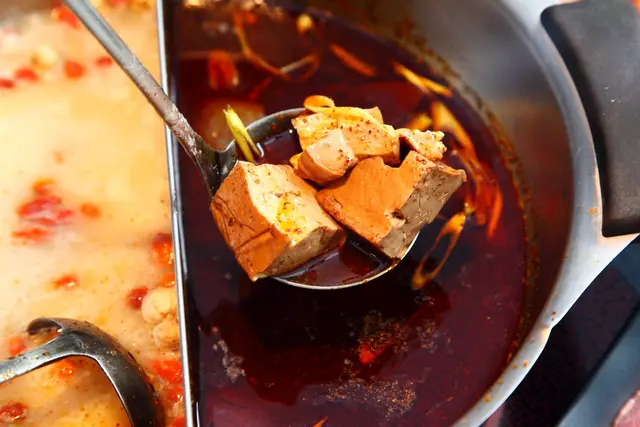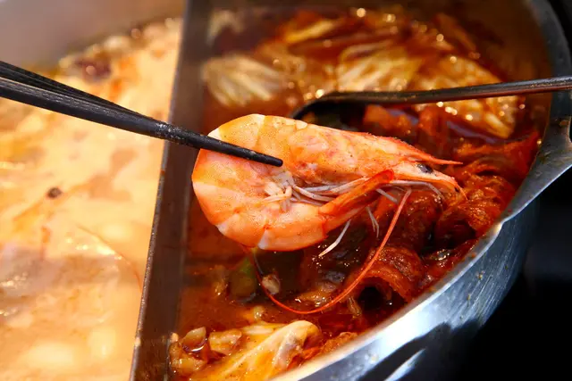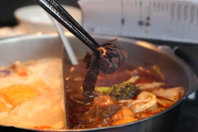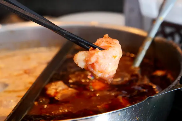 紅鍋:辛殿麻辣鍋對於湯底的製作相當嚴格,使用來自四川的純種川辣乾,大紅袍花椒和郫縣豆瓣,再搭配多種秘傳中藥食材,產地直送北港頂級黑麻油,純正正宗四川川辣乾,大紅袍花椒粒,先以大火爆香,再以小火拌炒兩小時,再加入細火熬煮十二小時的高湯,如此繁複的做法才能造就辛殿麻辣鍋後醇滑順且帶著豐富層次的鍋底風味~