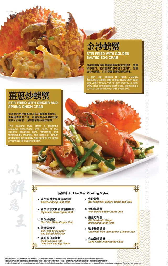 這次珍寶海鮮餐廳可以說是誠意十足了,珍寶海鮮的特色是提供10種活蟹料理,其中新加坡辣椒螃蟹是曾經獲獎的料理,其他有招牌黑胡椒螃蟹、白胡椒螃蟹、椒鹽焗螃蟹、花雕蛋白蒸螃蟹、金沙螃蟹、奶油焗螃蟹、薑蔥炒螃蟹、砂煲粉絲螃蟹、金絲奶油螃蟹,多種螃蟹料理的手法,就為了滿足各種饕客,近期推出了600g的活螃蟹,每隻NT1,480元就能品嚐到活螃蟹料理!