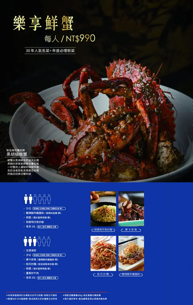 這次推出二~三人的樂享鮮蟹套餐,目前在平日中午、晚上供應,樂享鮮蟹套餐包含了一隻600g沙公可選一種螃蟹料理做法,以及3-5道菜+茗茶,可說是珍寶海鮮史上最大優惠呢!