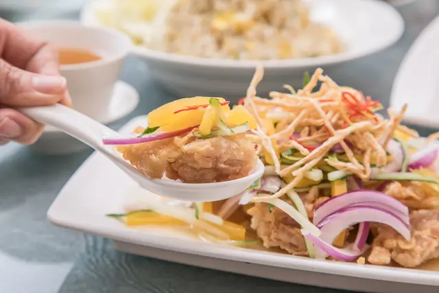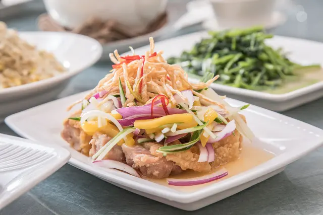 夏天吃最清爽的酸辣雞腿排,吃黑胡椒螃蟹再來點酸辣雞腿排挺解辣的,酥炸雞腿排淋上充滿果酸氣息的醬汁口感清爽不膩,綴上炸過的魷魚絲,呈現多層次的味覺口感