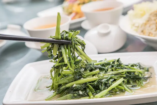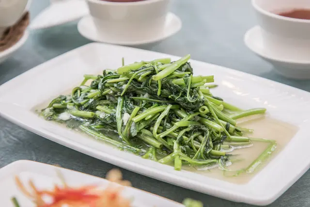 新加坡料理口味多半較重,所以都會配上一盤清爽的炒青菜,今天的是空心菜,大火炒出空心菜的甜脆,好吃!