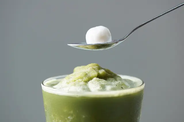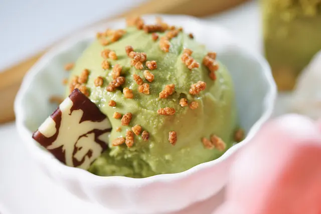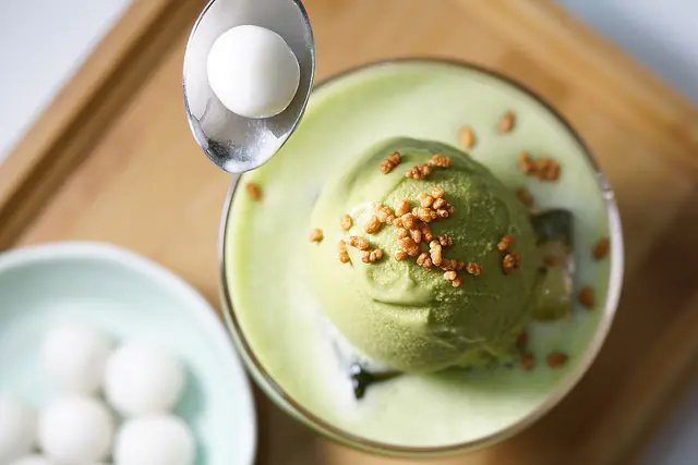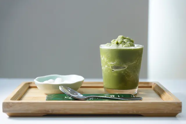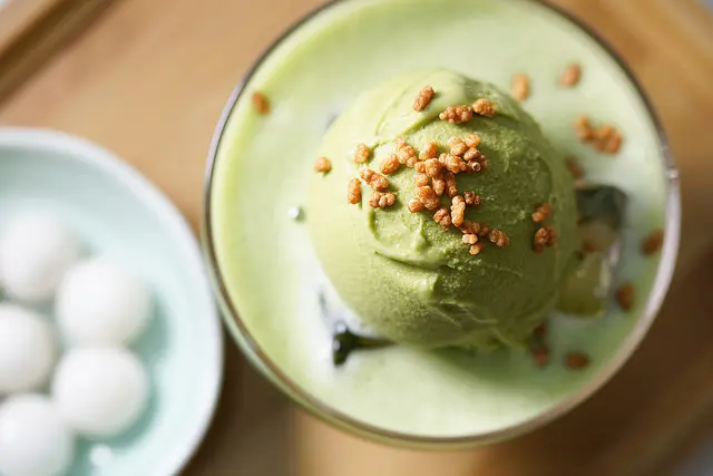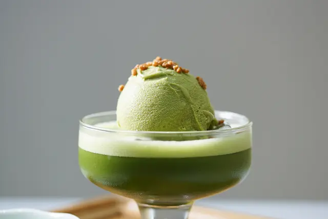 挖上一球圓潤的抹茶冰淇淋,小心翼翼地擺在濃抹茶上方,撒上些許的玄米粒