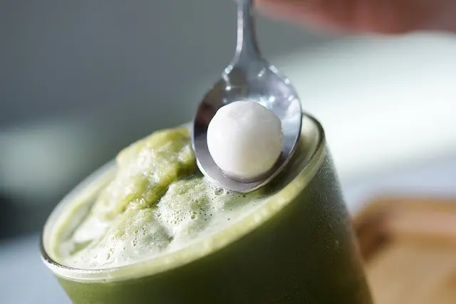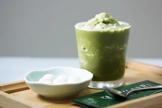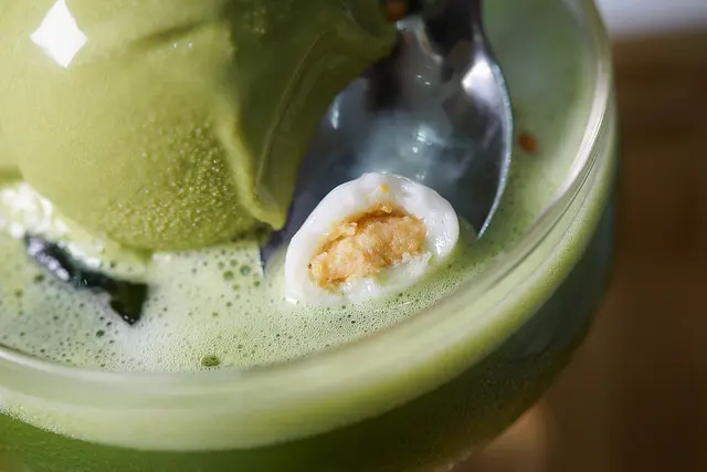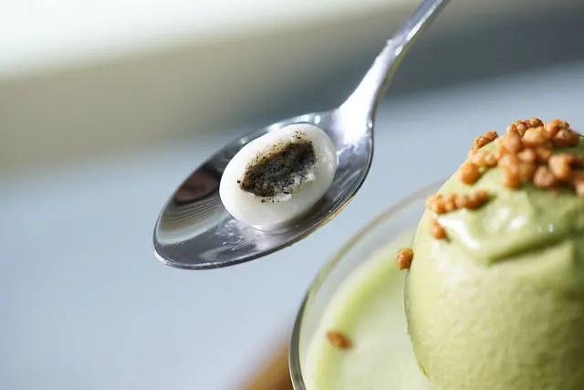 在細緻且輕柔的抹茶冰沙之間,加入了湯圓活潑的流沙內餡