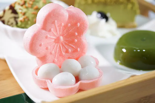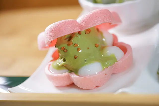 如櫻花般粉嫩色澤的最中餅,盛裝著圓潤的桂冠芝麻小湯圓及花生小湯圓