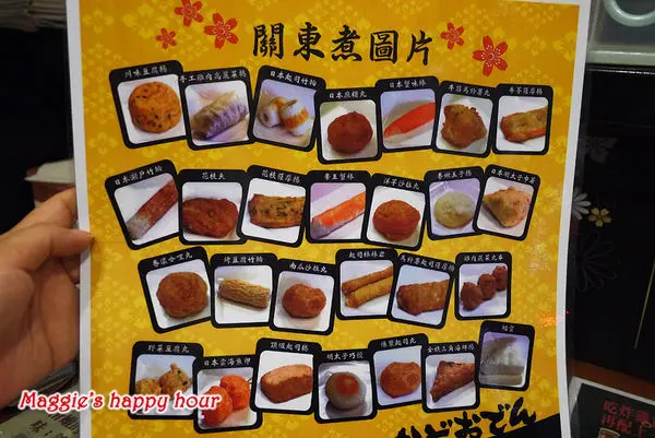 各式的關東煮圖片,種類很多,但巿售關東煮常見的米血糕這類東西是沒有哦!因為這裡賣的關東煮食材都是由日本進口,是正統的日本關東煮,不是台灣加料版的台式關東煮。還有這裡的關東煮都是現點現做,因此需要差不多8-10分鐘的等待時間,跟一般關東煮浸泡在高湯一整天的煮食方式不同,因為老闆堅持現點現做才能保有關東煮的原有風味。