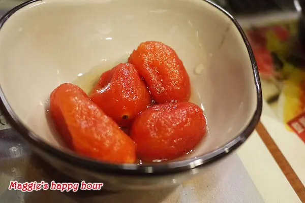 「紫蘇蜜蕃茄」是老闆特別招待的,別看這小小的蕃茄,它可是老闆用熱水把燙過的聖女小蕃茄去皮後,再加入紫蘇梅汁及桂花露調製而成的醬汁去醃漬而成的,它好吃的程度讓我把蕃茄放入口中就不禁回味起來,那sauce清爽又微酸甜的味道太逍魂,蕃茄本身充分吸收醬汁,但口感有保有聖女蕃茄的脆度,好吃到讓我連剩餘的湯汁都喝得一滴不剩,可惜老板時間有限加上蕃茄的產期也有一定時間,無法將這一味美食列入菜單常態供應,太可惜了啦!