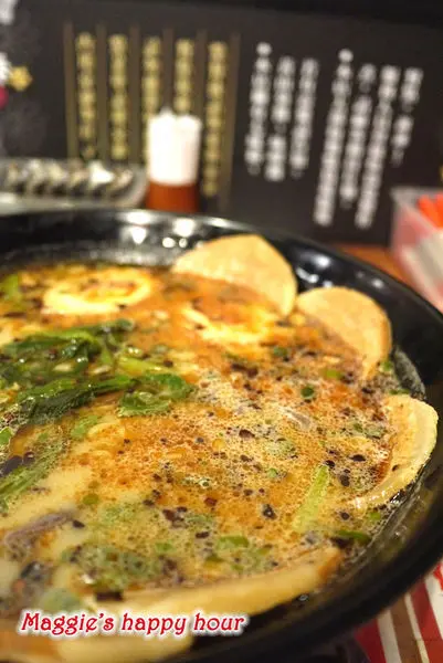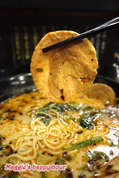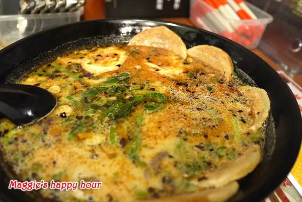 濃濃的豚骨湯頭顏色滿是許多食材精華,絕對不是用粉泡可以調出來的口感。如果個人對於湯頭的口味濃淡也可以跟老闆要求,可依個人喜愛來調味哦!我嚐了一口湯頭,微微的辣度我個人喝下也沒問題,不然平常我吃拉麵很少喝完湯,因為一般都偏鹹啊!