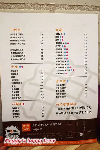 後來詢問同事們吃過後的感覺,都相當喜歡,我的推薦算有成功哦!Waffle Please除了提供內用的舒適空間外,還有貼心的外送服務哦!像內科附近有很多公司行號,許多都會在下午茶時間想吃點東西補充滿滿元氣,像是開會或活動都會需要訂些茶點,只要滿300元以上,在內湖地區這附近的皆可享有外送服務,想吃美味鬆餅時不用特別跑一趟,只要動手指打電話就可以送到你面前啦!