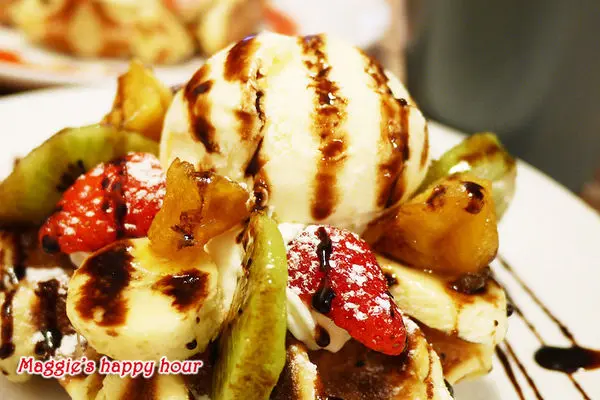 「繽紛水果冰淇淋鬆餅」上頭主要有一球香草冰淇淋,冰淇淋外圍的一圈放滿了奇異果、草莓、香蕉,還有焦糖蘋果乾。