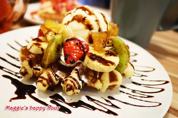 底下的比利時鬆餅外層包裹著一層薄薄的糖霜,咬起來外層酥脆,但咀嚼起來整體還保有著濕潤度,是我喜歡的那種口感,太乾的比利時鬆餅我就敬謝不敏了。
