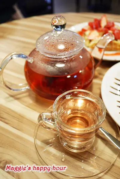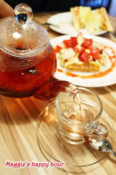 「蜜桃果茶」倒出來是淡淡的粉紅色,喝起來順口,我選擇不加糖來搭配鬆餅正好。