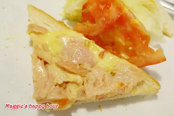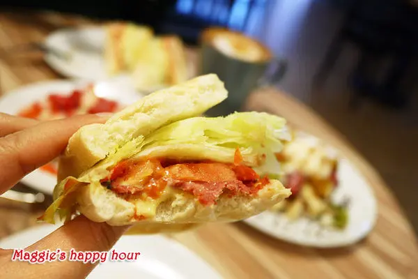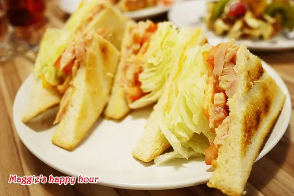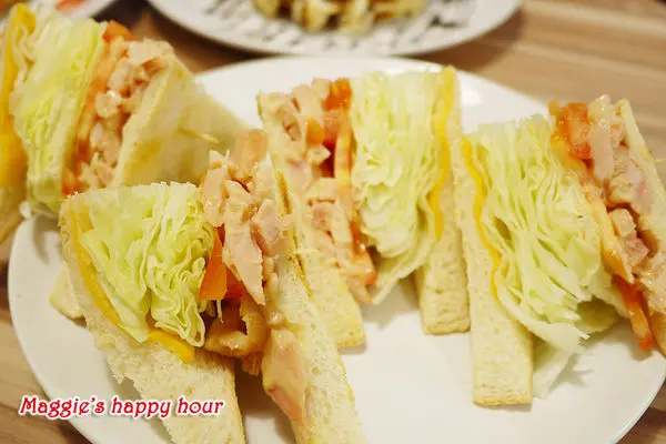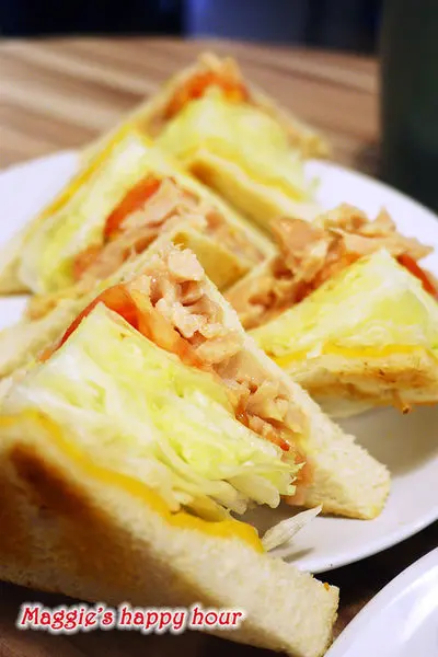 「煙燻雞肉三明治」外層烤成焦糖色的吐司夾著入味的煙燻雞肉和起士,跟著新鮮蕃茄和生菜,大口咬下去還會發出ㄎㄠˇㄎㄠˇ的聲音,和鬆餅鹹甜的搭配是我喜歡的一種吃法。