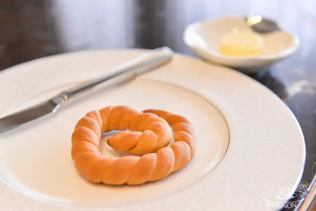 這道濃湯使用了帕瑪森薄片、焦化南瓜湯、雞脆皮、伊比利豬肉丸、蝦夷蔥,看似簡單的搭配但這南瓜湯熬煮的非常美味,常常喝到南瓜湯會帶些酸酸的氣味,這碗沒有這樣的氣味而是香濃的南瓜味,另外上方的南瓜脆片脆口有像是南瓜蛋捲的感覺很好吃,伊比利亞的豬肉腸雖然說很細緻但是有豬肉的鮮味!