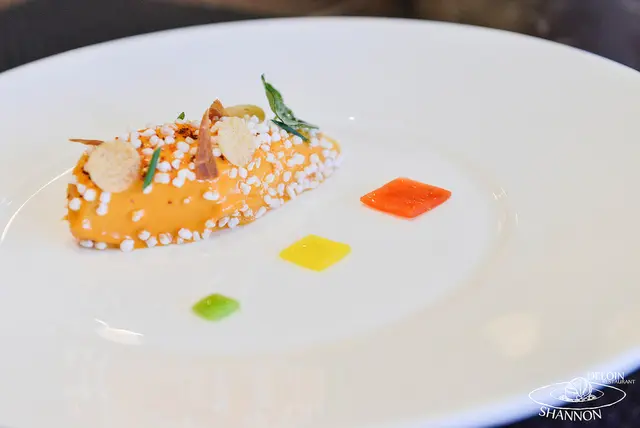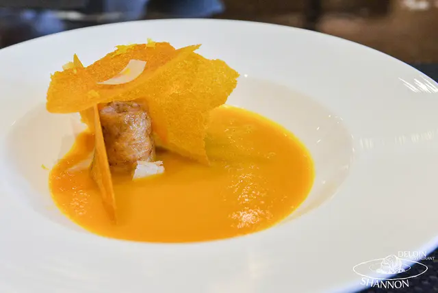 焦化南瓜襯乳酪辛香風味伊比利 Scorch pumpkin veloute with harissa flavor crispy Iberico meat ball and parmesan