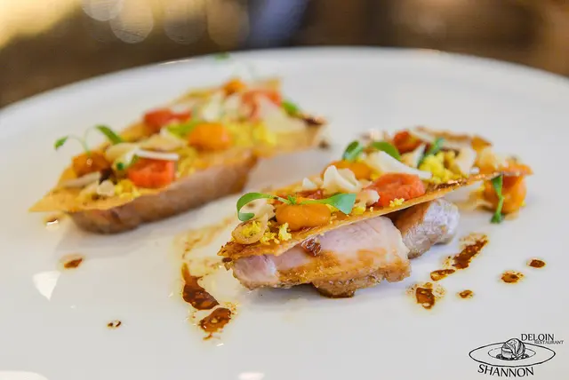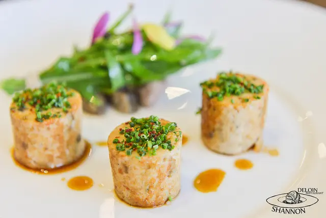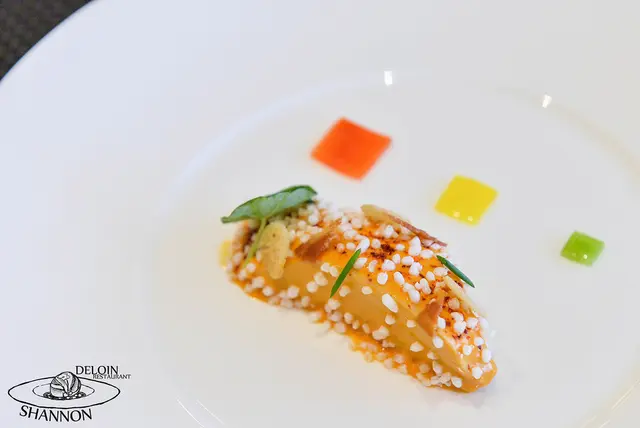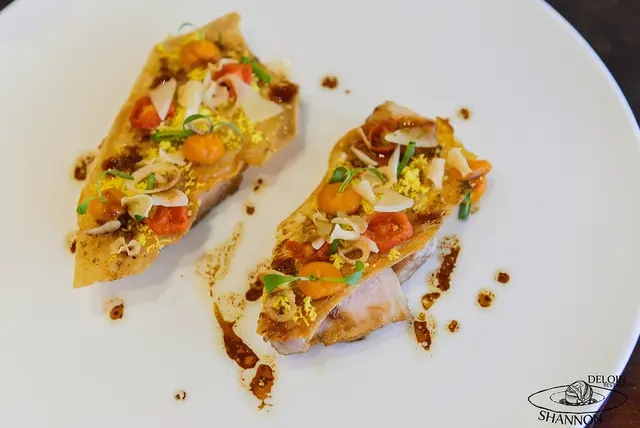 這道料理使用了雞胸肉、紅椒泥及鵝肝醬、道明寺米、培根片、蝦夷蔥段、金蓮葉、紅椒、黃椒及青椒等,外層的紅椒泥及鵝肝醬包覆了雞胸肉,而味道濃郁卻不搶風頭,雞胸肉一入口的口感非常軟嫩外還不時可以咀嚼到酥脆的寺米,口感層次豐富相當好吃!