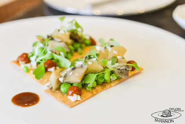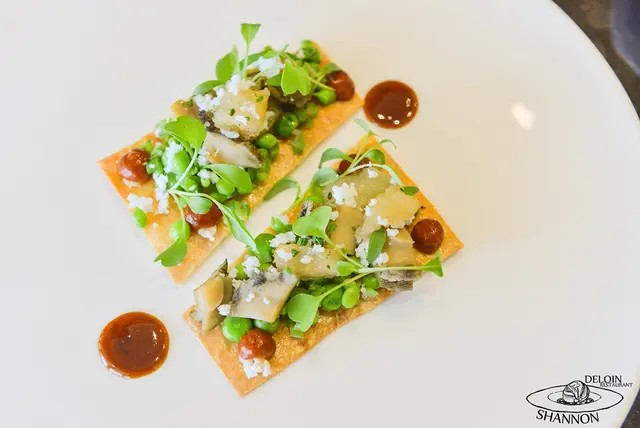 這道料理使用了螯蝦、玉米雞胸、玉米雞腿、綜合香料蘑菇製作了這主食、生菜部分為紅捲、綠捲、蘿蔓及紅莧搭配油封雞胗、油封雞心、油封雞肝最後以蝦夷蔥、辣椒粉、白胡椒做調味和裝飾,主食的口感偏軟加上點彈性品嚐起來就有明顯的雞肉的香氣,不會鹹口整體讓我覺得很香,蔬菜下的油封雞內臟一起入口很脆又越嚼越香!