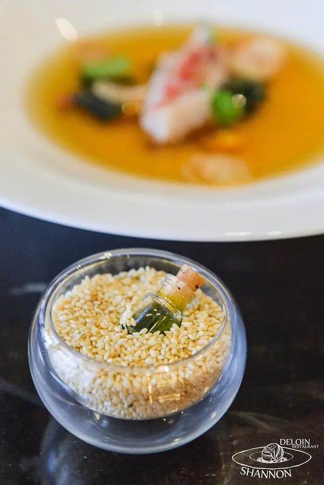 食材有干貝、喇叭菇、杏鮑菇、百里香、烏魚子粉末或紅椒粉、芽蔥搭配上雞澄清湯,這干貝是日本來的且是生魚片等級的鮮美又嫩口,澄清雞湯需燉煮數天不眠不休地在火爐旁顧著,品嘗起來雞的香氣十足濃郁非常的好喝!