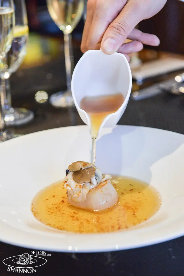 金湯燉汁鮑魚搭配煙燻柿椒塔 Cantonese-style Chicken jus stew abalone with green pea.snap baen smoked red pepper flavor tarte