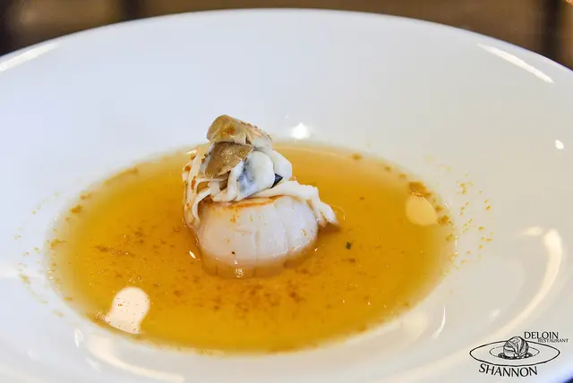 黑金干貝菌菇雞澄清 Seared scallop and Mullet roe with saute king oyster mushrooms, black trumip,chicken consommé