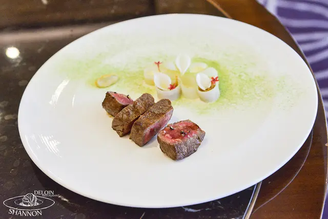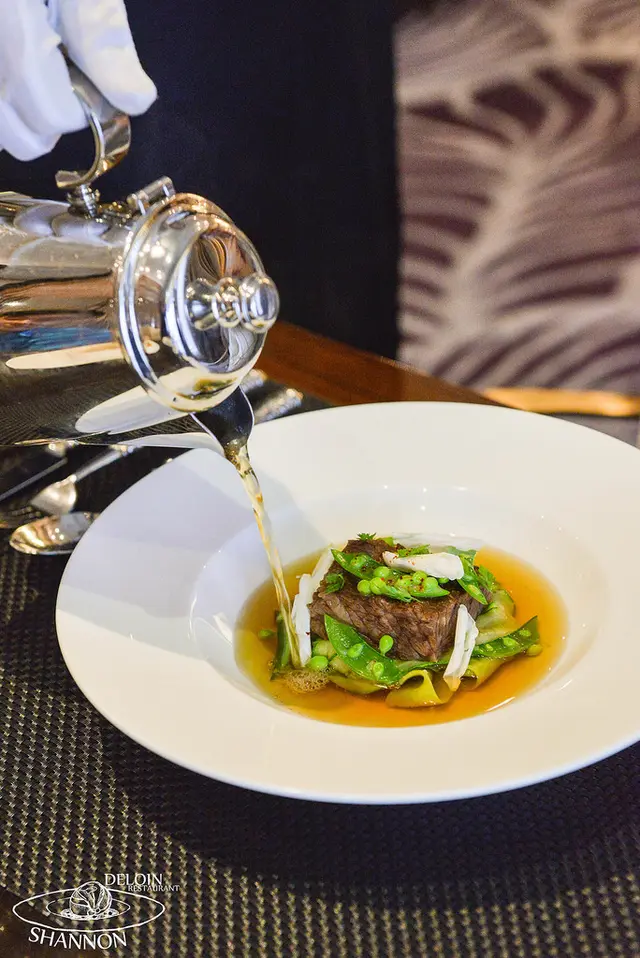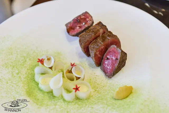 慢燉洋蔥和牛搭配乾酪青豆 Seared waygu beef, with Stew onion paste, green bean potato ribbo NT. 2,500