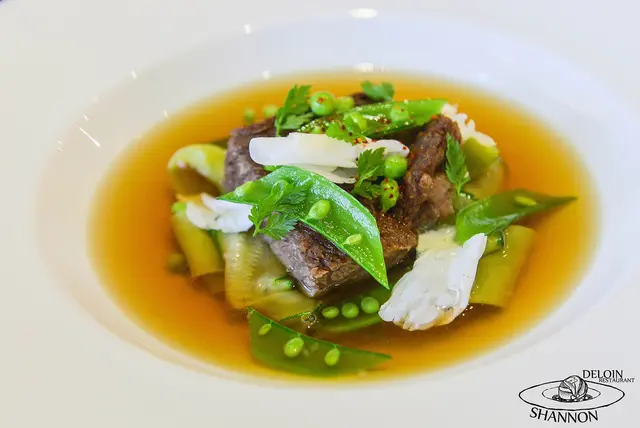 香花豌豆節瓜寬麵搭配燉煮牛小排 Green zucchini flavor pappardelle with stew beef short ribs consommé Stew beef short ribs NT. 1800