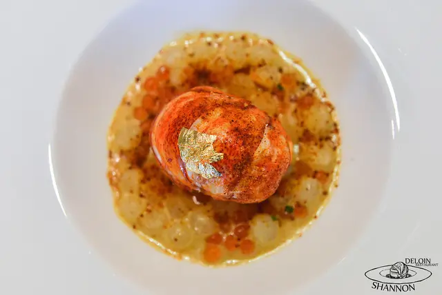 食材有:加拿大野生龍蝦、鮭魚卵、Nage Sauce、黃金櫻桃番茄、烏魚子及好大一片金箔點綴