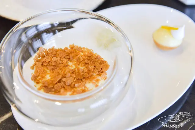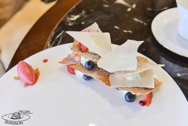 這是德朗餐廳 De Loin Restaurant的甜點師傅作品,名稱不明但是看的出有點千層派的概念
