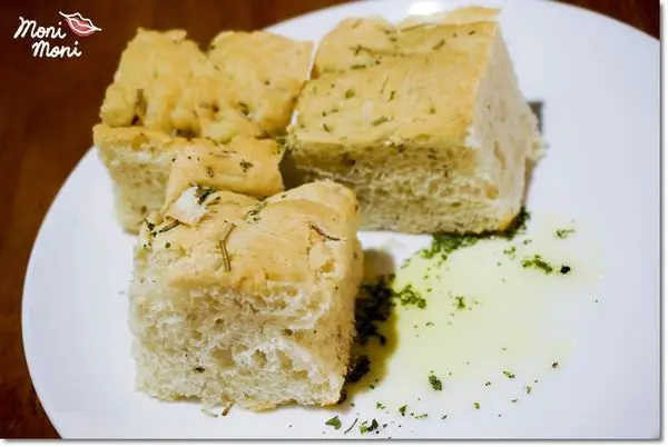 佛卡夏的麵包沾佐青醬,多了迷迭香、橄欖油後味道蠻香的。