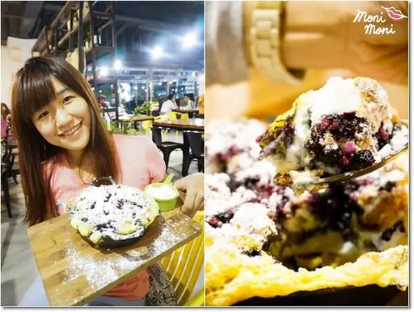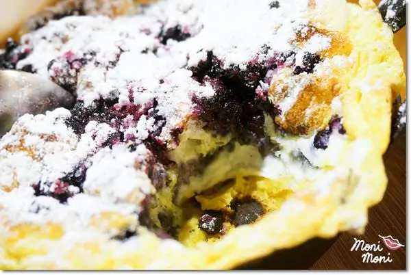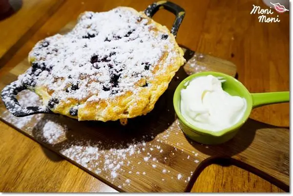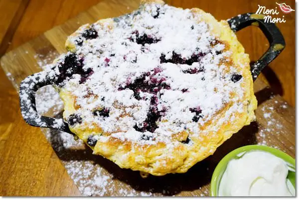 一個大鐵鍋上面可是一份相當彭派的藍莓舒芙蕾,上面灑滿了雪白的糖霜、藍莓,旁邊還有現打鮮奶油可搭配,