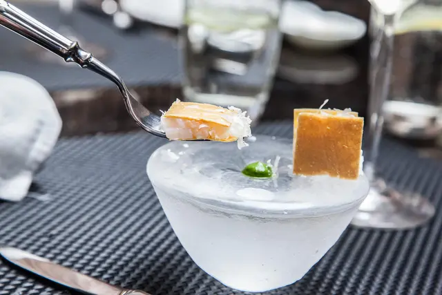DE LOIN德朗餐廳這次推出的餐廳週套餐主打簡約呈現食材的本位為主,融入日式料理的技法及法式料理的精緻為一身,像這道銀芽透抽搭配佐青醬就非常特別,而且這器皿也太厲害了,不說咬咬還以為是放在冰塊上呢